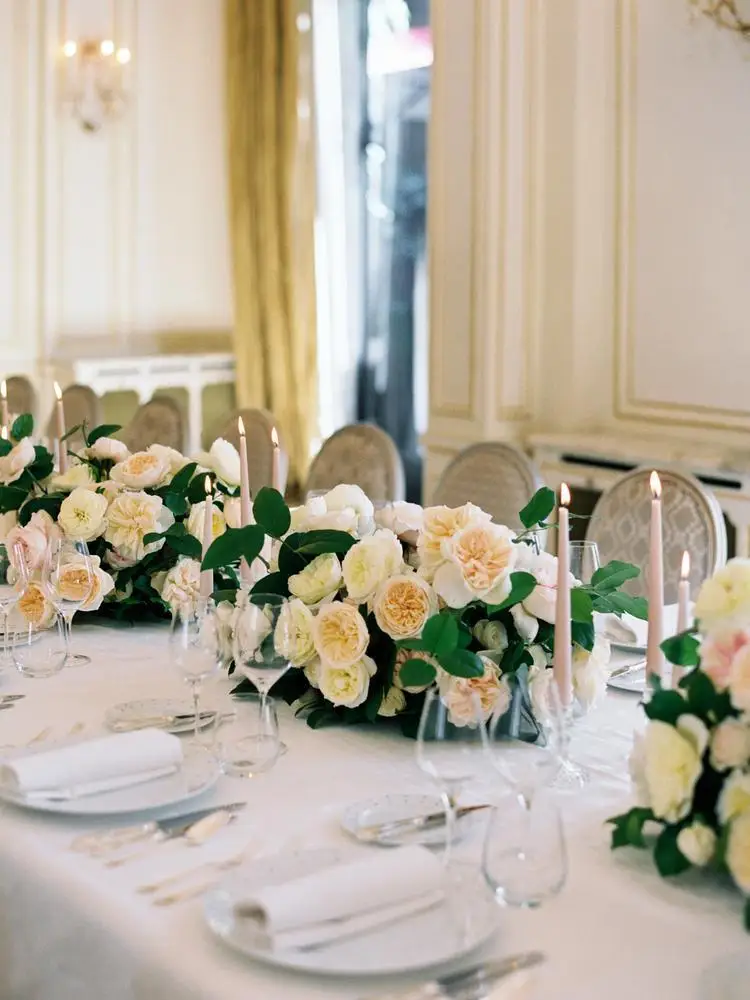 This luxury city wedding exudes classic Parisian elegance, with a chic, understated palette of ivory, white, and blush. The all-rose bouquet is stunning in its simplicity, pairing perfectly with fashion and accessories that offer a subtle nod to the city's renowned style. Sophisticated elegance continues throughout the wedding reception. Le Salon Organza, overlooking a picturesque courtyard and the hotel's iconic red canopies, provides a striking backdrop, while the roses contrast beautifully with the gilded and glamorous interior. Inspirational, serene and decadently designed, this ivory wedding embodies timeless sophistication and effortless style.